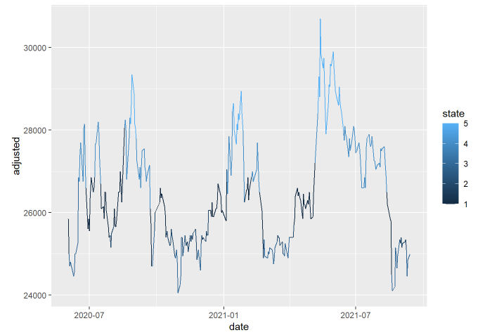 시계열 데이터에서 state(상태) 나타내는 것을 은닉마르코프 모형이다. 은닉 마르코프 모형에서 어느 시점에서 구입해서, 어느 시점에서 판매하는 것이 가장 좋은 것인지, 판단 하려면, 그래프를 이용한 EDA를 하여야 한다.